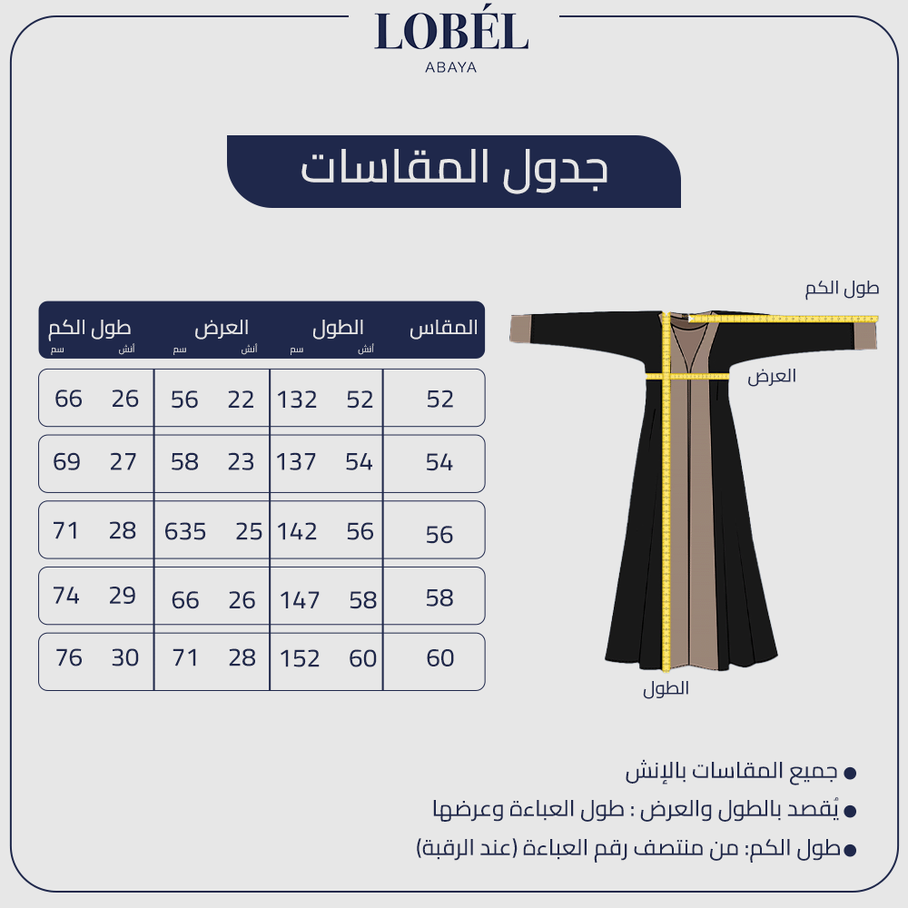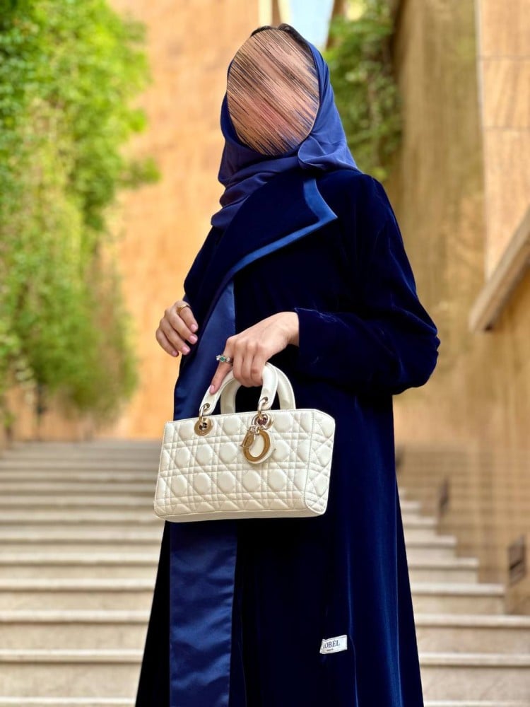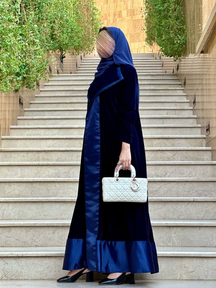 استمتعي بالأناقة والفخامة مع عبايتنا المصنوعة من المخمل الناعم. تجمع هذه العباية بين اللونين الكحلي والزرقاء في تصميم عصري وأنيق، مما يجعلها مثالية للمناسبات الخاصة والسهرات.